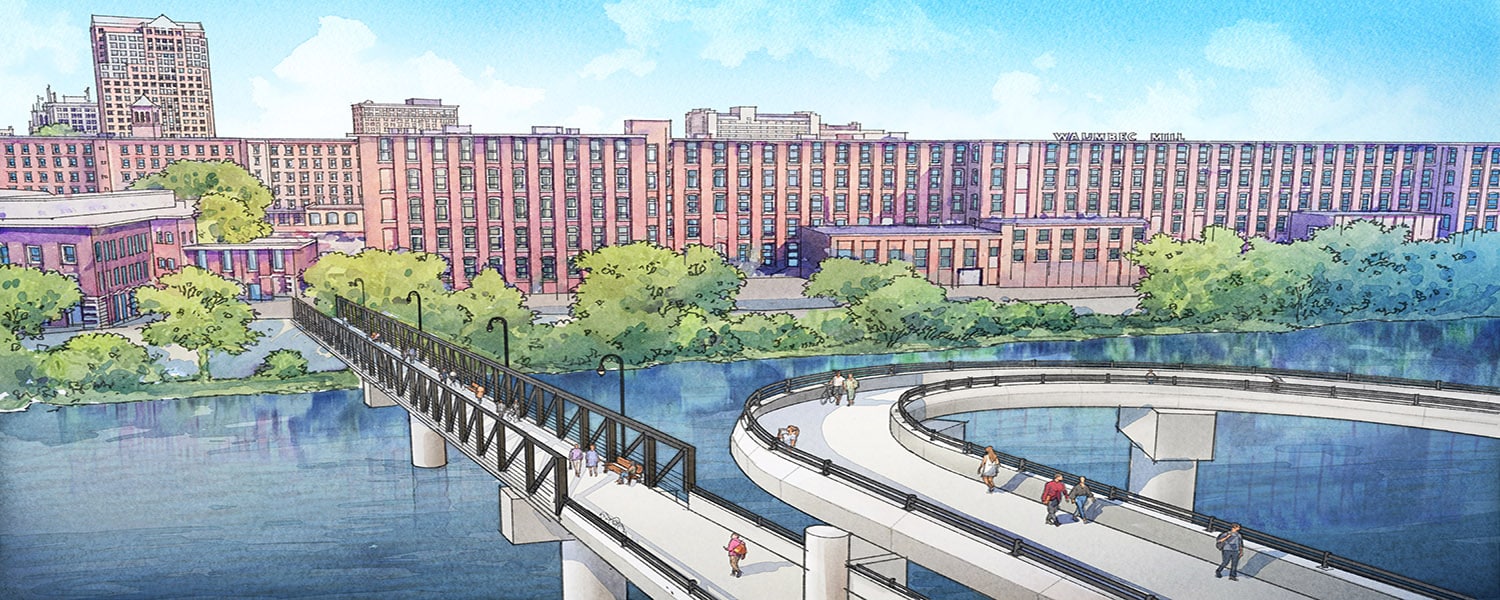 Hoyle Tanner assisted on two of the application’s components, the pedestrian bridge which would span the Merrimack River in the historic Millyard, and the Aviation Education Facility that is envisioned to be a Teaching Airport. For the pedestrian bridge Hoyle Tanner was tasked with the conceptual design to span the Merrimack River from Foundry Street on the west side of the river to the Millyard on the east side. Our services included conceptual layout, cost estimating, writing an environmental narrative, a Preliminary Engineering Report (PER), and a project narrative. Sketches included plan views, profile views, and colored renderings to represent the new bridge.
