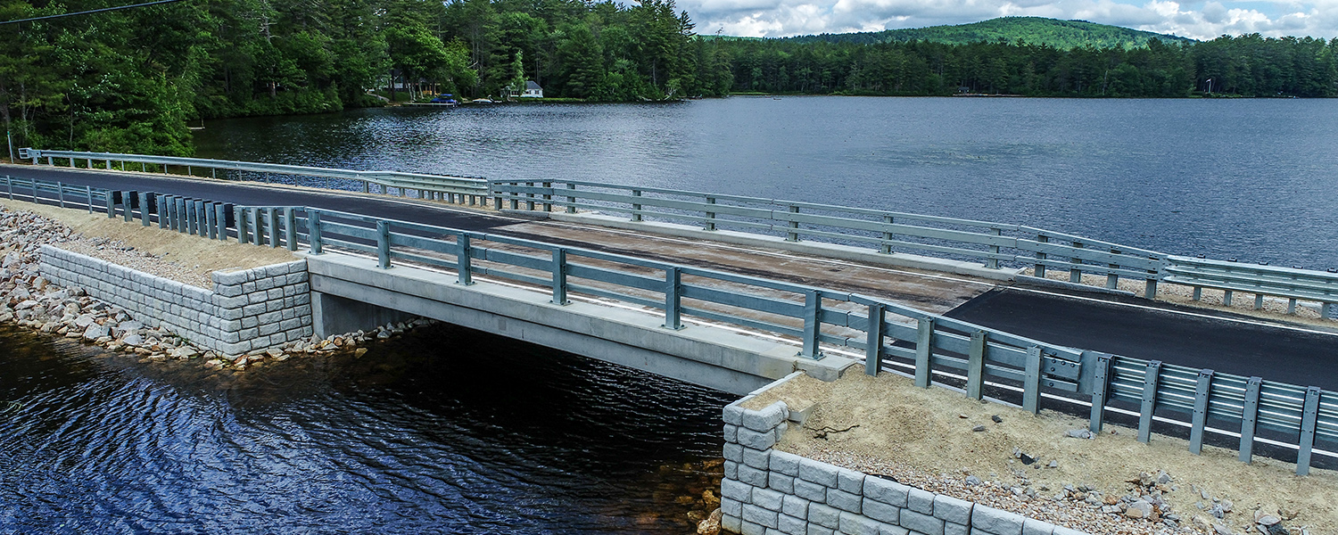 The Town of Gilmanton retained Hoyle Tanner to prepare an Engineering Study to investigate replacement options for the Crystal Lake Road Bridge over Nelson Brook. The purpose and need for the project was to remedy the deteriorated condition of the bridge and substandard railings to improve roadside safety and extend the service life of the bridge in a cost-effective manner, while minimizing environmental impacts and delays to the traveling public and other users. Other goals were to maintain or increase the existing navigational clearance for recreational boats, meet NHDOT geometric and load carrying capacity requirements, and minimize impacts to abutting properties and utilities. Through several meetings with town officials and local residents, it was concluded that complete closure of the bridge during construction was feasible for this project. Construction time was minimized to a maximum of 75-day closure through the use of accelerated bridge construction techniques. The project included the replacement of the existing 10’ concrete slab bridge with a 38’ design span prestressed concrete deck beam superstructure supported on precast concrete caps and micropiles.