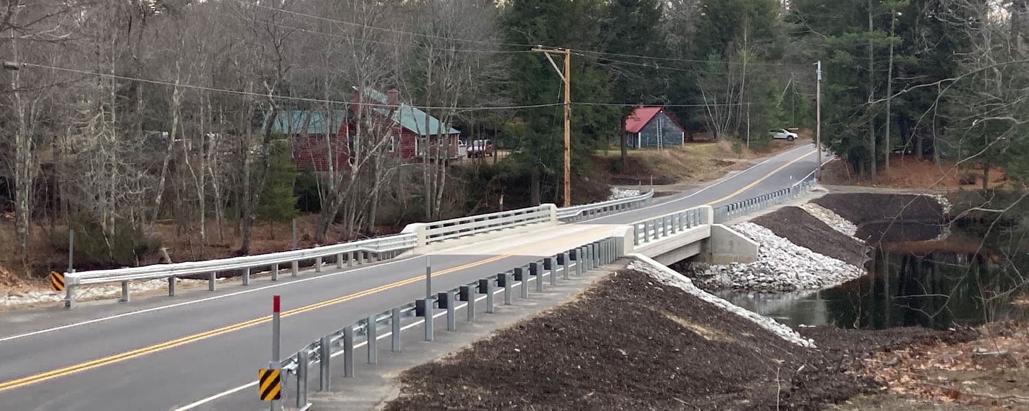 Hoyle Tanner provided professional engineering services for the bridge replacement of twin 14’ diameter metal pipe culverts with a 75’ span NEXT Beam with integral abutments. Preliminary and final design services included: hydraulics, scour evaluations, habitat connectivity design, public outreach, bridge design, roadway design, and final plans, specifications, and estimate. The superstructure includes a bare concrete deck with integral wearing surface and a roadway width of 24’. A single lane temporary bridge maintains traffic during construction. The project also included several hundred feet of approach roadway reconstruction with improvements in the vertical alignment and roadside safety.
