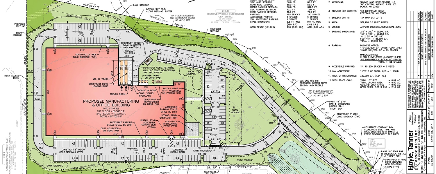 Hoyle Tanner was retained by Summit Land Development LLC to provide civil/site design services for Galvion’s (formerly Revision Military) new Advanced Warfighter Equipment Development Center at the Pease International Tradeport. The center will feature a warfighter lab, armor prototyping and a development facility that is expected to create upwards of 75 new jobs for the Seacoast. The first phase of the building is 41,800 square feet with an additional 55,900 square feet planned for phase two.